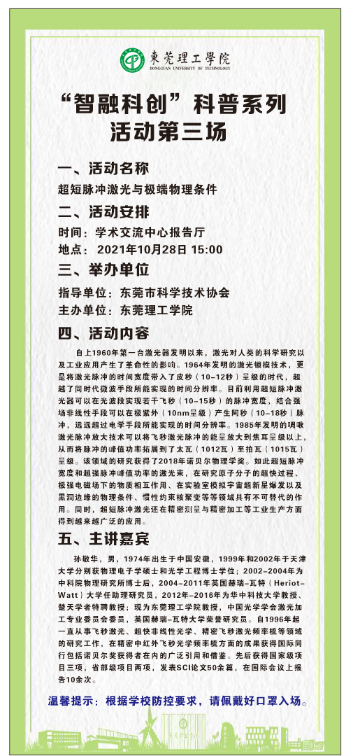 莞工科普系列活动|2021年第3场:超短脉冲激光与极端物理条件