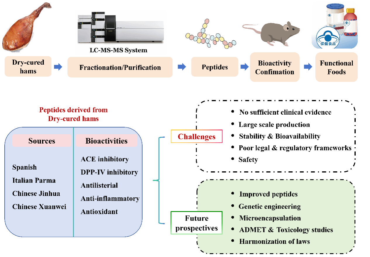已有研究表明,生物活性肽(Bioactive peptides,BAPs)具有多种营养功能和生物活性,适当摄入可以使机体的营养状况更为全面。生物活性肽具有多种对人体有益的功能,包括抗氧化、抗菌、抗病毒、抗癌、抗高血压、抗糖化、抗血栓、降胆固醇、预防心血管硬化以及免疫调节作用。食源BAPs已越来越多地被应用于功能性食品的开发。其中,干腌火腿这类传统发酵食品在微生物以及内源性酶的作用下可产生大量的BAPs。这些BAPs具有开发成功能性食品的巨大潜力。然而,食品源生物活性肽的生物利用度有限,阻碍了其在功能食品开发中的利用。此外,全球范围内关于生物活性肽及相关产品的法律监管框架还不完善。大量临床试验和法律监管要求的协调配合将加快生物活性肽产业的快速发展。可以预见,全球生物活性肽产业具有良好的发展前景。本文综述了不同国家和地区的干腌火腿中的多种生物活性肽,详细介绍了生物活性肽的生物功能活性、制备方法、生物利用度和代谢稳定性以及各国的法律和监管框架。本综述的主要目的是深入挖掘干腌火腿的潜在营养功能,并为食品来源,特别是干腌火腿源的生物活性肽的商业化利用与开发提供理论支持。